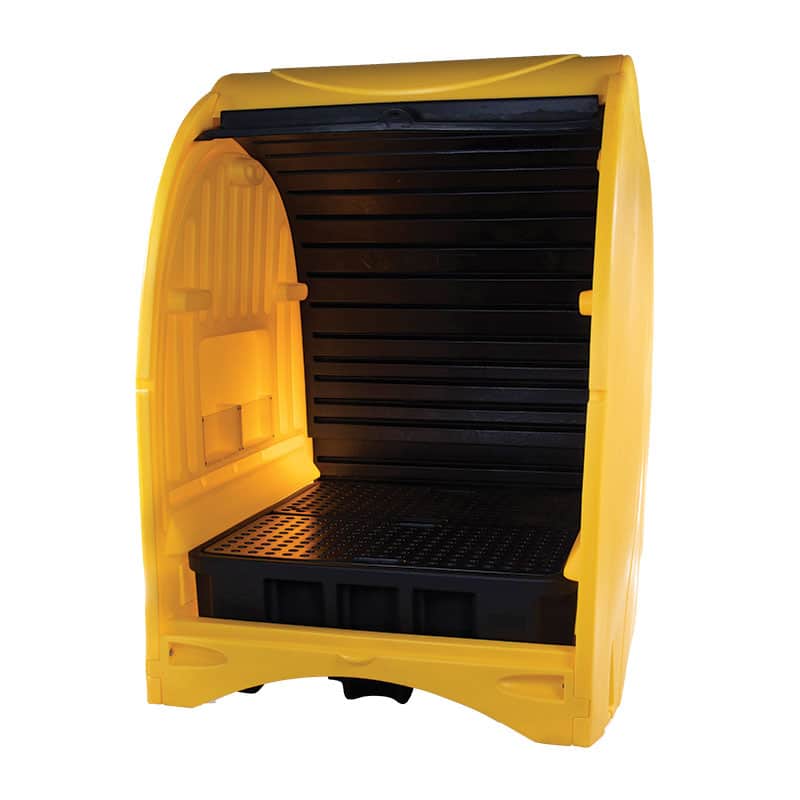 L’abri de rétention fermé ou box de rétention est équipé d’un rideau avec une ouverture dans les 2 sens. Fermeture par cadenas possible (non inclus). Le toit permet de laisser l’eau de pluie s’évacuer. Cet abri possède un espace suffisant pour pouvoir y stocker des pompes, mélangeurs, entonnoirs…