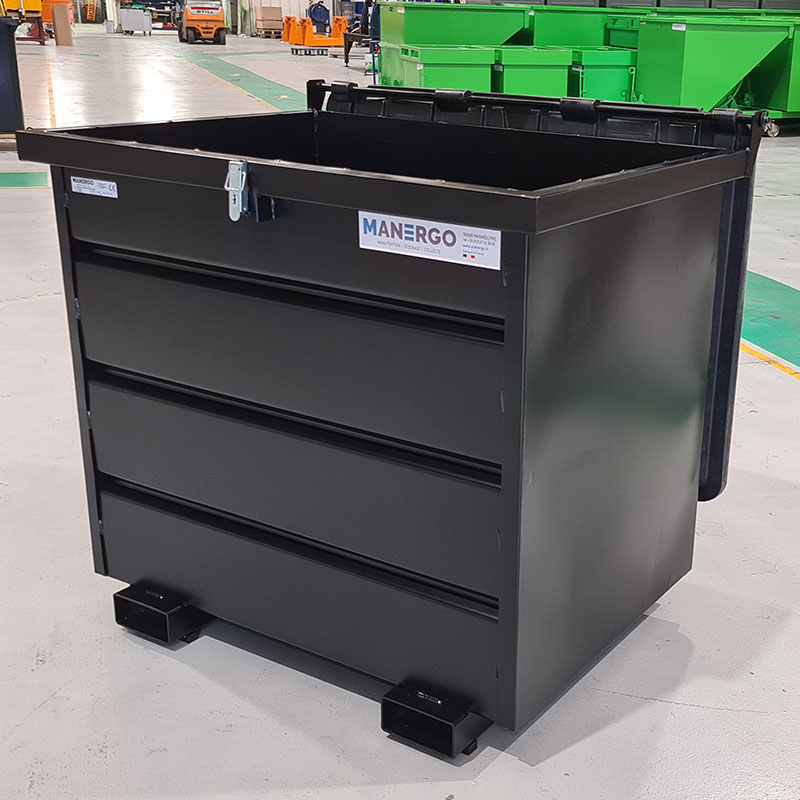 Cette benne pour chariot à tête rotative 1 000 L, référence BTR1000-4284, permet le stockage des déchets dans vos ateliers. Équipée de fourreaux, elle peut être vidée par retournement grâce à vos chariots spécifiquement équipés de têtes rotatives.